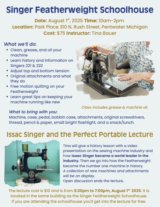 | Requirements: | Bring any attachments included with your machine. This included the lecture from 5:30-7pm. |